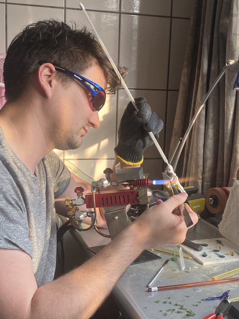 Lampworking is a type of glasswork that uses a torch to melt the glass. Once in a molten state, the glass is formed by blowing and shaping with tools and hand movements.