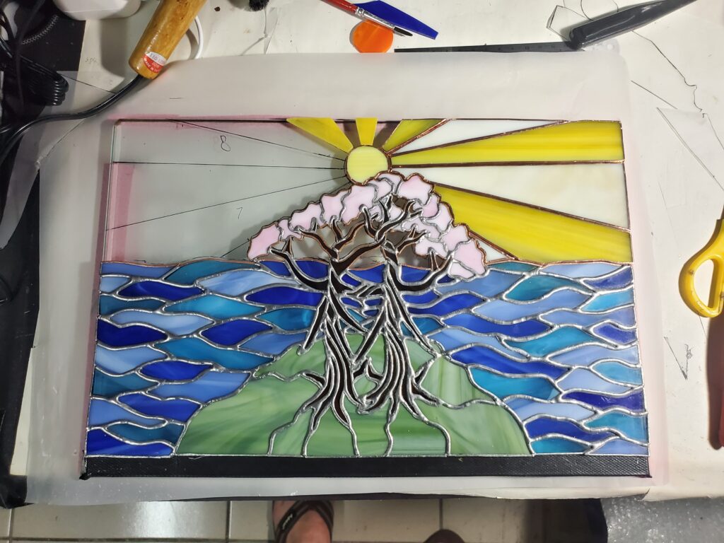 Is a technique where pieces of glass are cut, sawn and grinded in a certain wished shape. After this the glass will be wrapped around the edges in a copper tape. This copper tape will be the base for soldering the pieces of glass together and so creating one whole panel.
